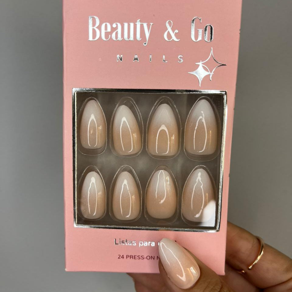 3. Pegar: Aplica una capa uniforme de pegamento en las uñas naturales y en la parte posterior de las uñas Beauty & Go.