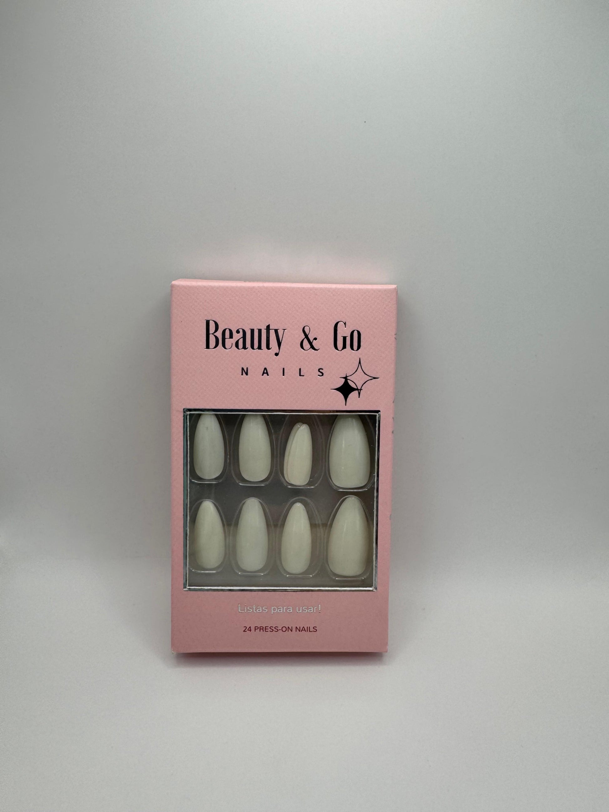 3. Pegar: Aplica una capa uniforme de pegamento en las uñas naturales y en la parte posterior de las uñas Beauty & Go.