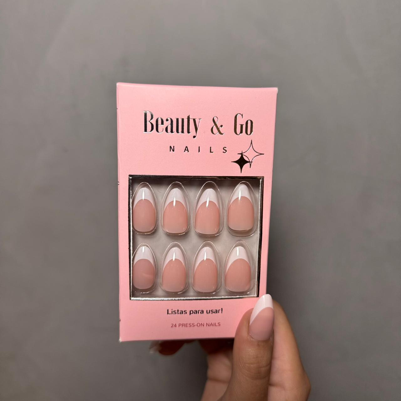 3. Pegar: Aplica una capa uniforme de pegamento en las uñas naturales y en la parte posterior de las uñas Beauty & Go.