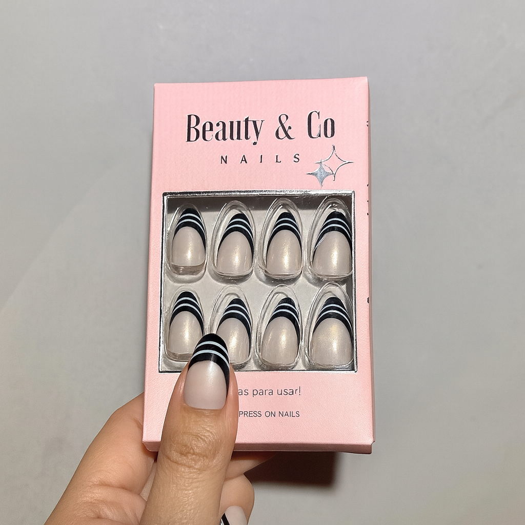 3. Pegar: Aplica una capa uniforme de pegamento en las uñas naturales y en la parte posterior de las uñas Beauty & Go.