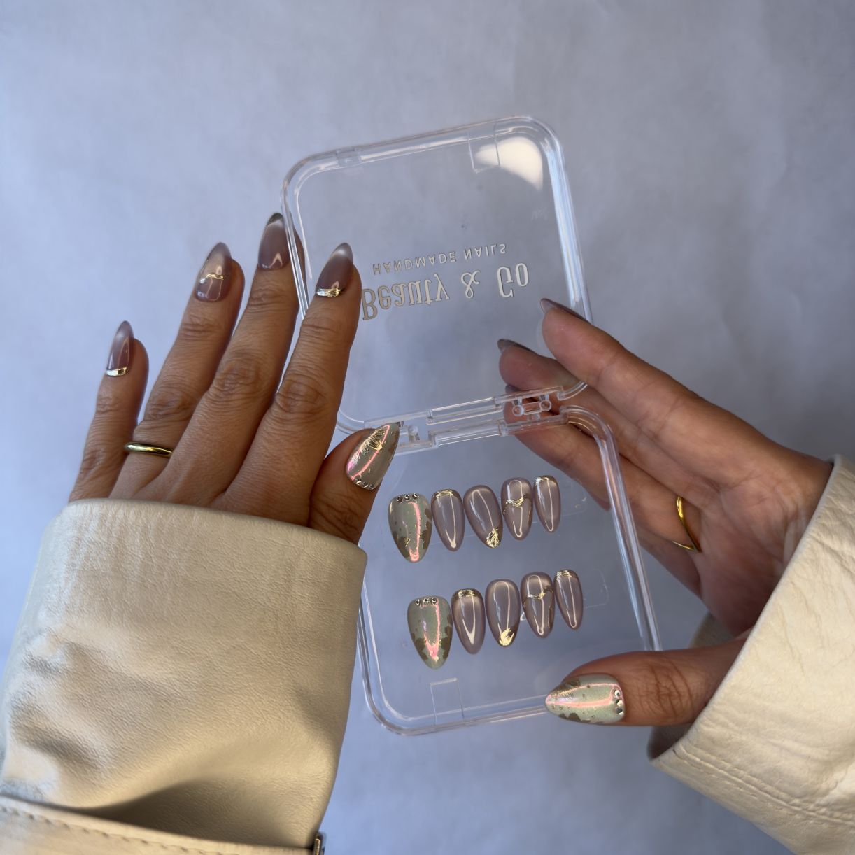 2. Pegar: Aplica una capa uniforme de pegamento en las uñas naturales y en la parte posterior de las uñas Beauty & Go.