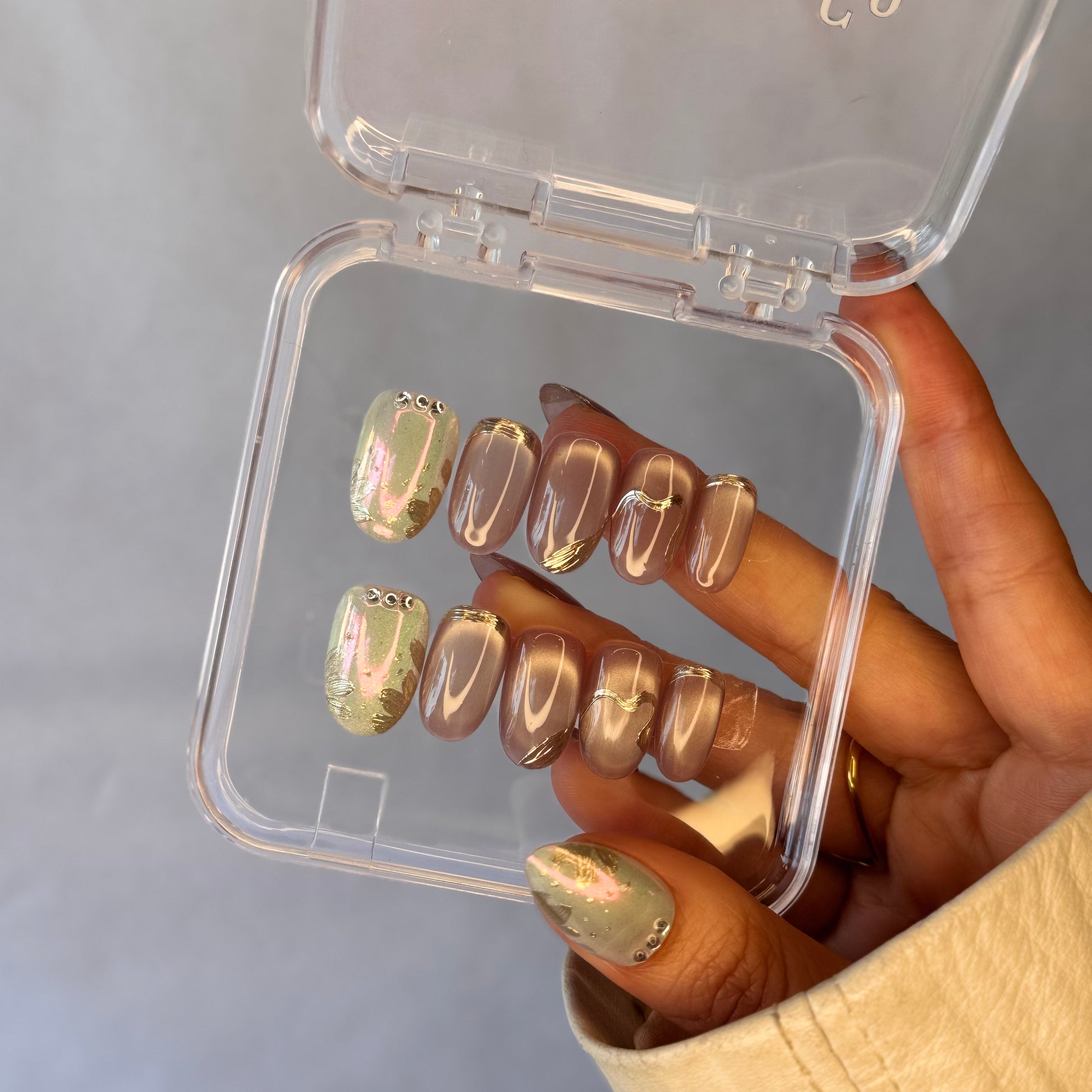 2. Aplicación con Pegamento de Uñas (Opcional): Aplica una capa uniforme de pegamento en las uñas naturales y en la parte posterior de las uñas Beauty & Go.