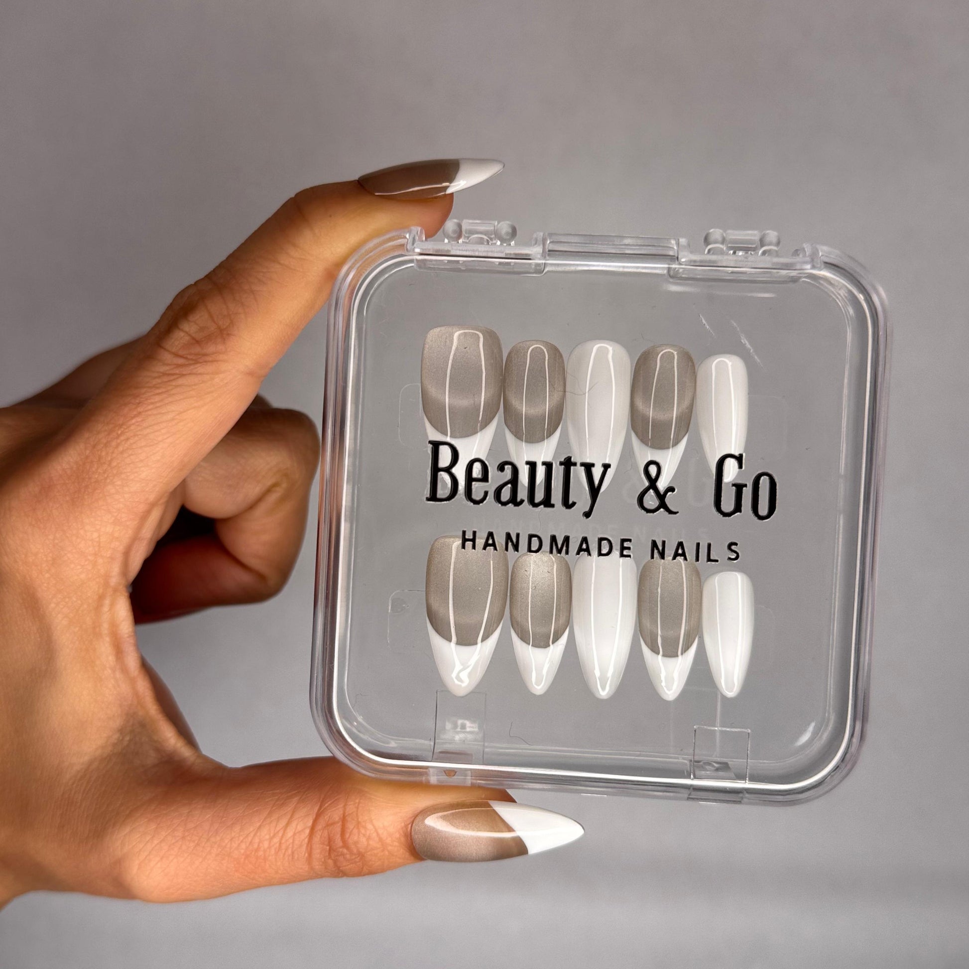 2. Pegar: Aplica una capa uniforme de pegamento en las uñas naturales y en la parte posterior de las uñas Beauty & Go.