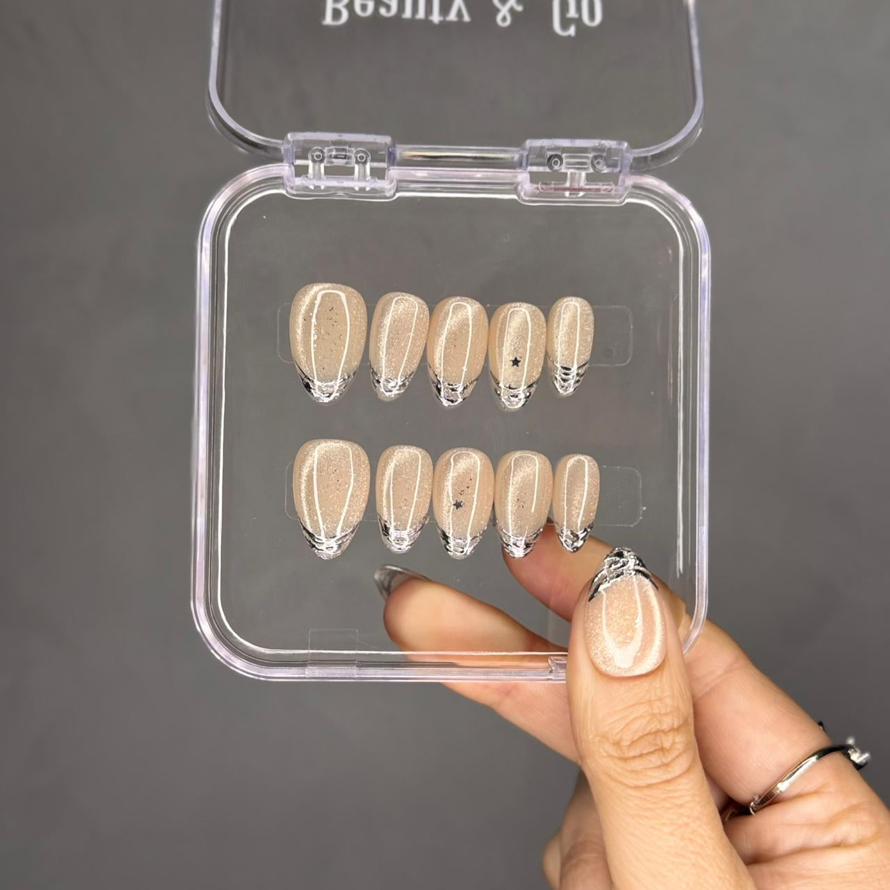 2. Aplicación con Pegamento de Uñas (Opcional): Aplica una capa uniforme de pegamento en las uñas naturales y en la parte posterior de las uñas Beauty & Go.