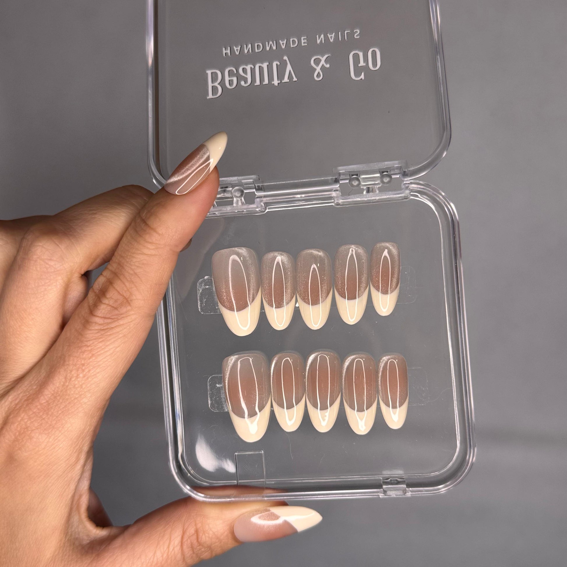 2. Pegar: Aplica una capa uniforme de pegamento en las uñas naturales y en la parte posterior de las uñas Beauty & Go.