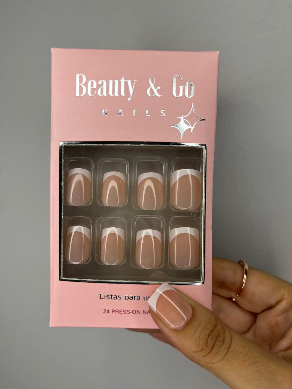 3. Pegar: Aplica una capa uniforme de pegamento en las uñas naturales y en la parte posterior de las uñas Beauty & Go.